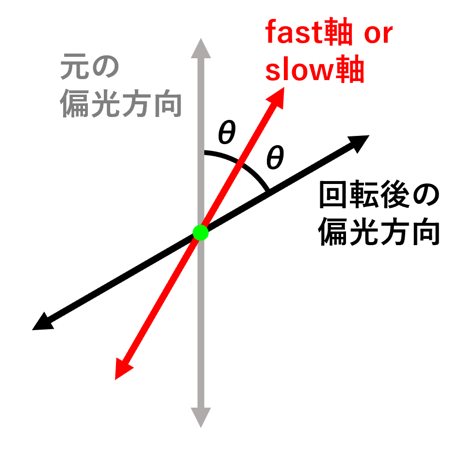 だけ回転させた位置に来る。もしくは、別の言い方をすると、回転後の偏光方向はFast軸またはSlow軸に対して鏡うつしさせた位置に来る。とりあえずこれだけ覚えておけば、実験で1/2波長板を適切に扱えるようになるだろう。